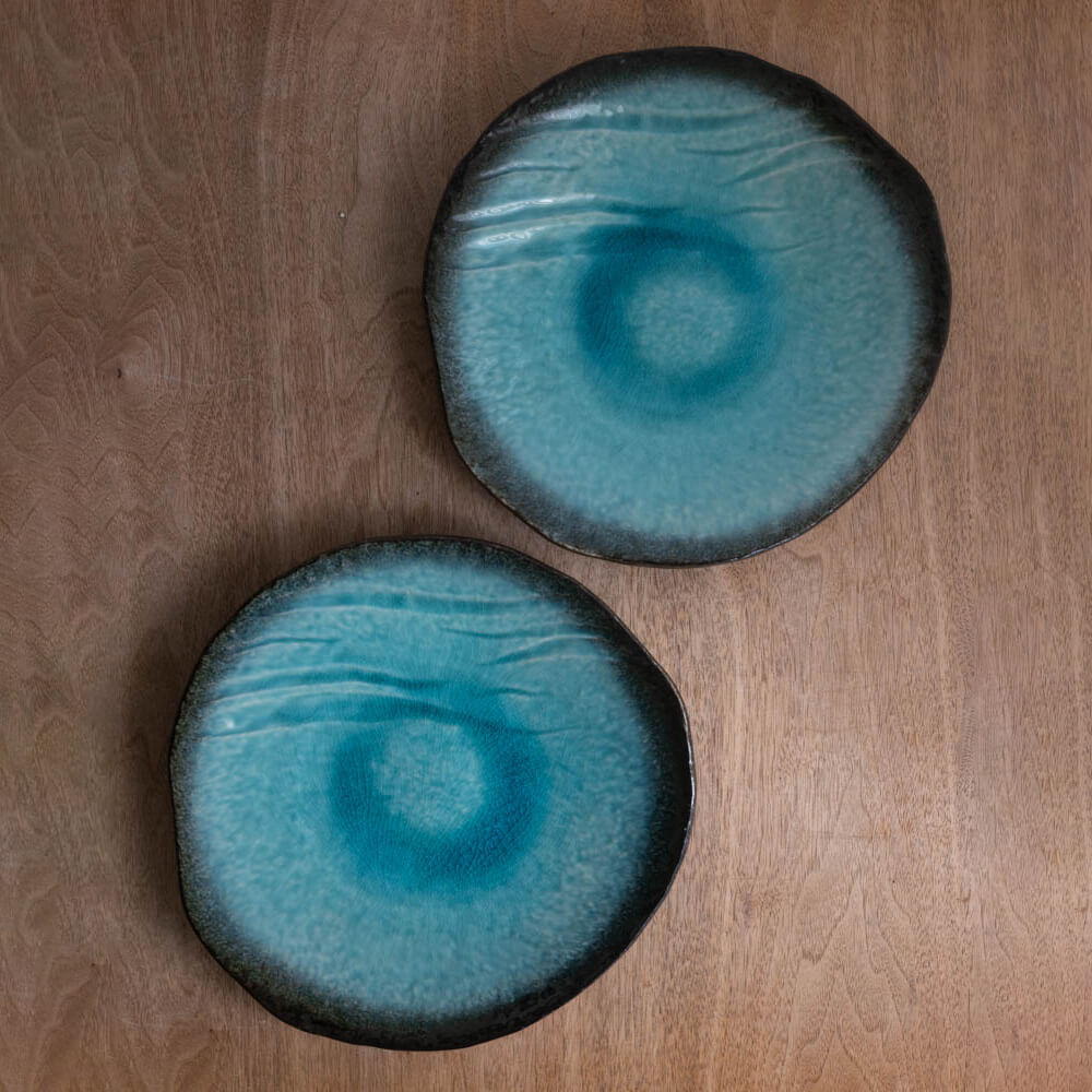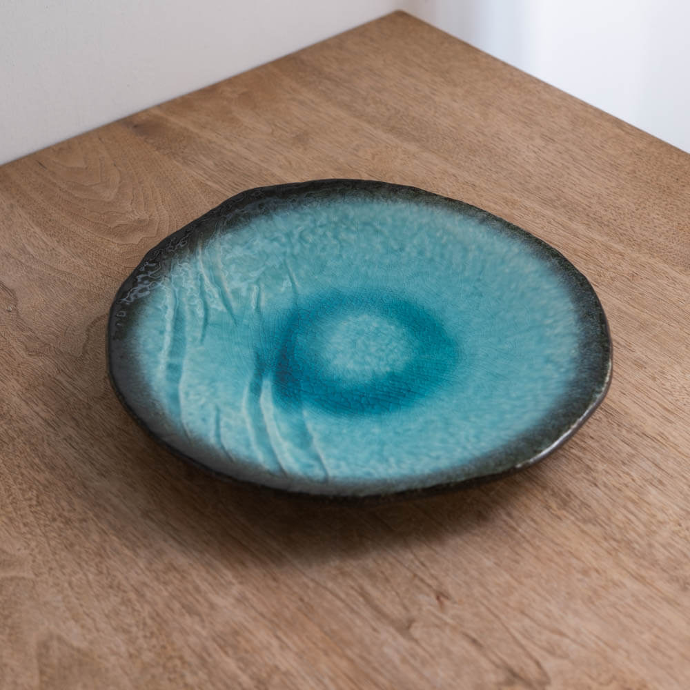 内側には、釉薬が溜まることで生まれた濃淡のグラデーション。淡い水色から深いターコイズへと、層のように色が重なります。表面には細かな貫入が広がり、光の角度や時間帯によって、きらめき方が変化。一枚ごとに異なる表情を楽しめる、奥行きのある釉調です。