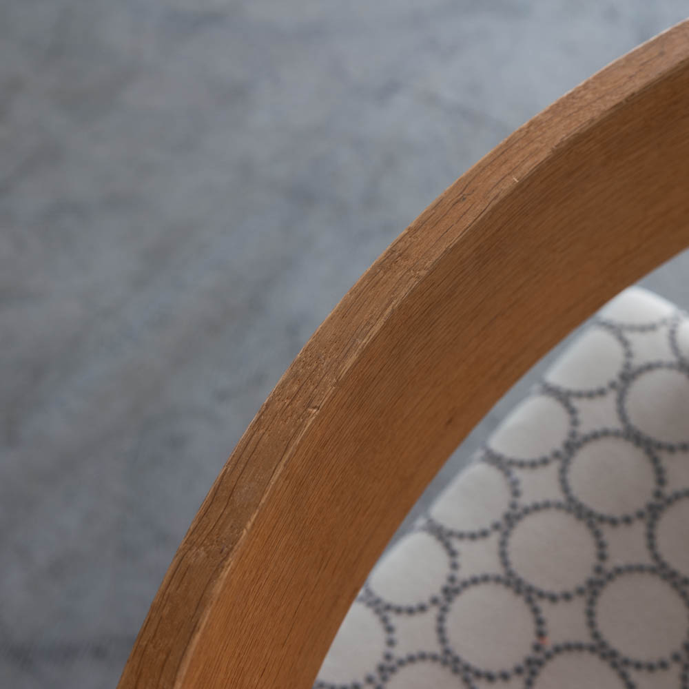 座面には、円が連なる刺繍が特徴の tambourine dop を採用。立体感のある刺繍は、プリント生地にはない奥行きを生み、近づいたときにこそ感じられる、上質さがあります。この図案は minä perhonen を象徴するデザインのひとつ。主張しすぎず、木の質感と調和する点も、この椅子に選ばれている理由です。