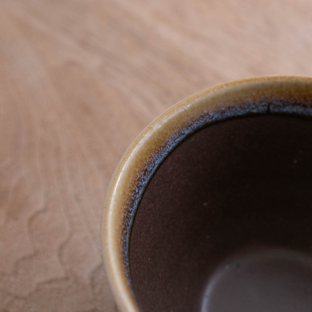 落ち着いた茶色の器肌に、縁をなぞるように現れる黄土色の釉。内側へ向かって、青みを含んだ釉が静かに溶け込み、ひとつのマグの中に自然な濃淡を描いています。青釉ならではの発色が、見る角度や光によって表情を変え、日常の時間にさりげない奥行きを添えてくれます。