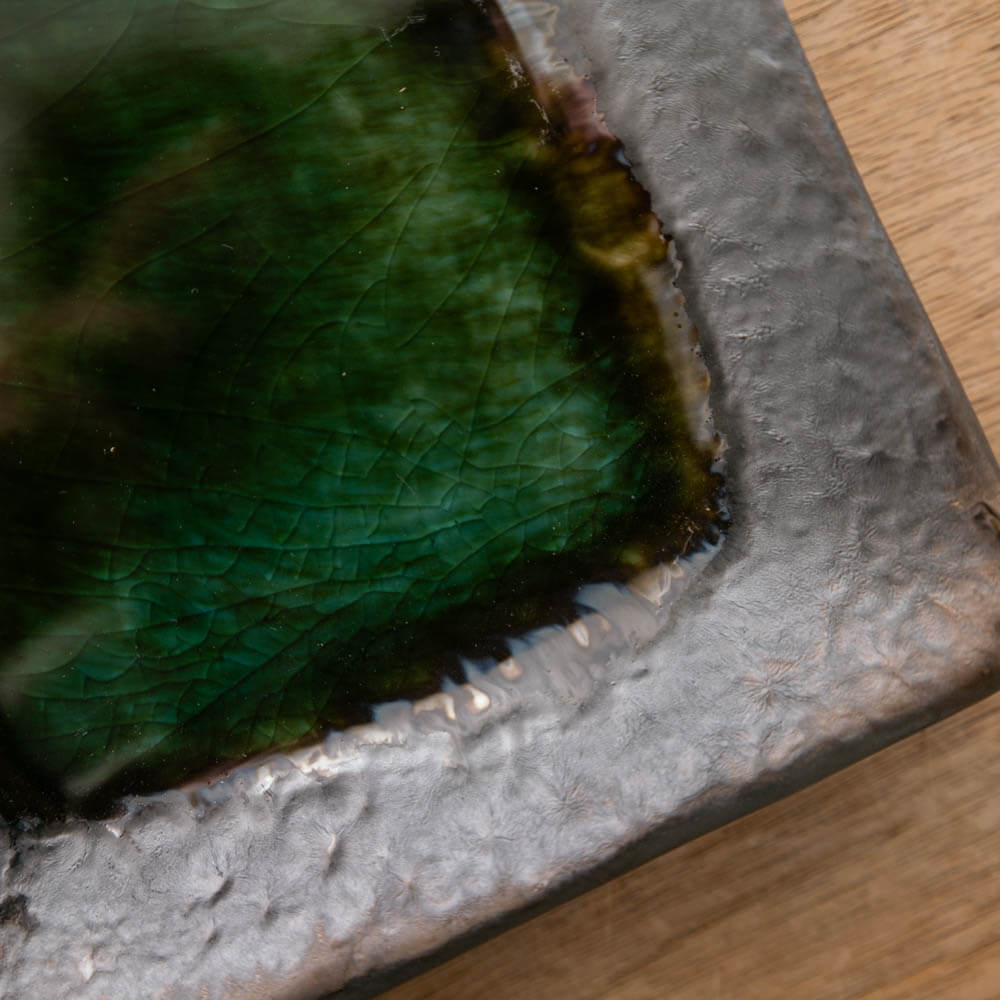 縁はまるで金属のような色合い、中央には深い緑が静かに溜まる。その境界には、釉薬が冷え固まる過程で生まれた貫入(かんにゅう)が静かに走ります。均一ではないからこそ生まれる奥行きと緊張感。盛り付けを主張しすぎず、けれど確かな存在感を残す。そんな“静かな強さ”を持った焼き物皿です。