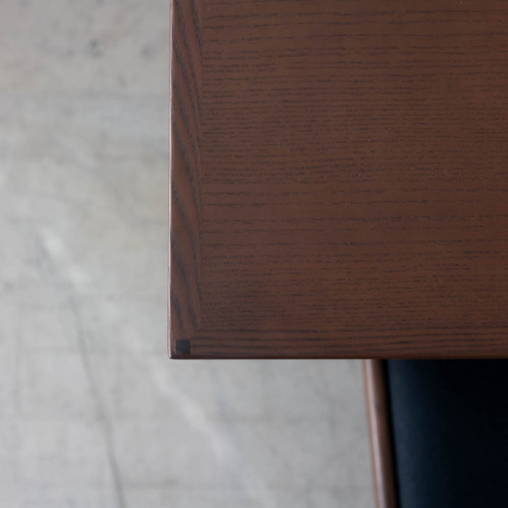 主材にはホワイトアッシュ材を使用。木目が比較的まっすぐで表情が美しく、家具材として高い評価を受ける木材です。ダークブラウン色に仕上げることで、木目の陰影が穏やかに浮かび上がり、空間全体を引き締めながらも重くなりすぎない印象に。無垢材と合板を適材適所で組み合わせることで、反りや歪みを抑え、日常使いに適した安定感を備えています。