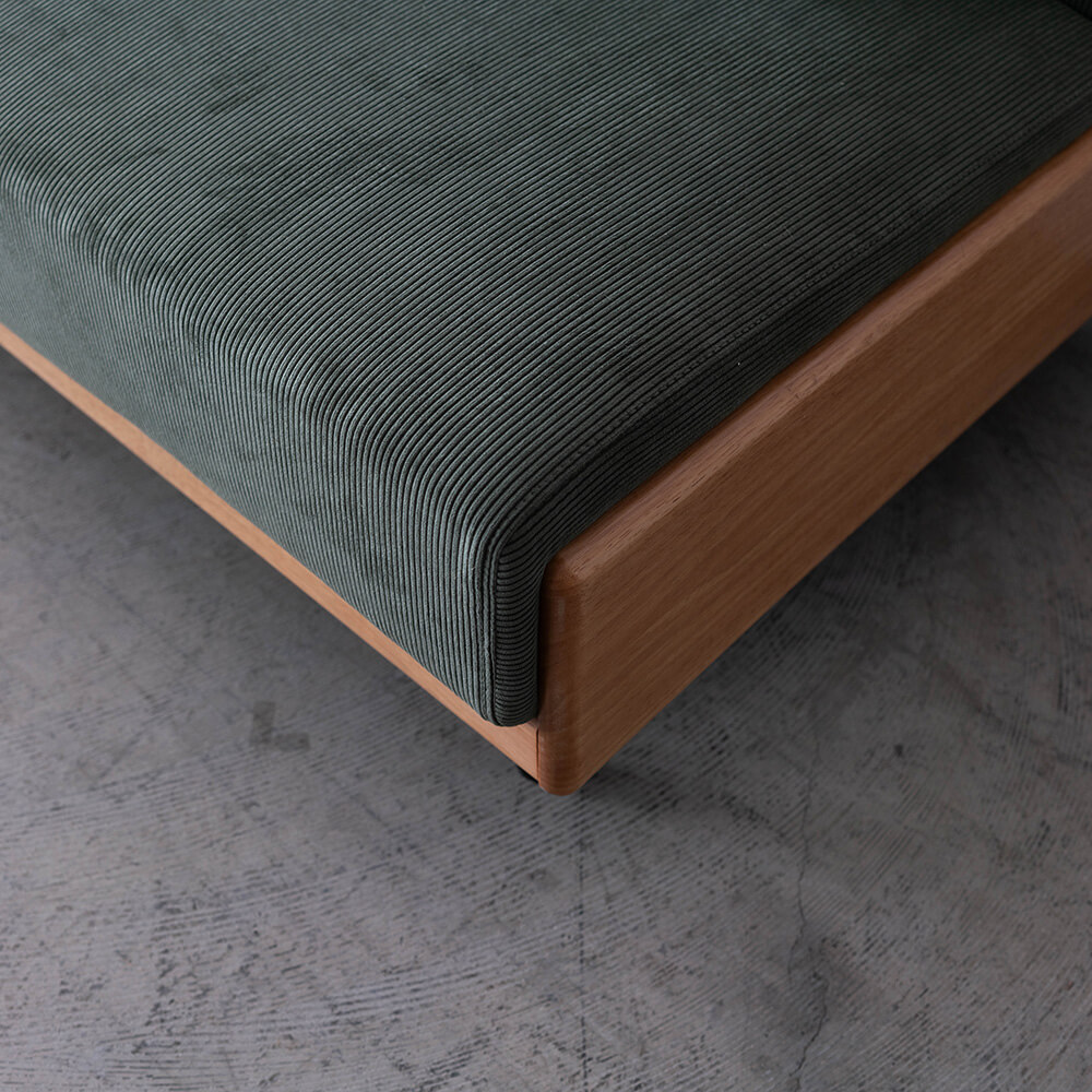 畝のあるコーデュロイ生地は、光の当たり方で表情が変わり、空間に奥行きを生み出します。ラバーウッド無垢材は、適度な硬さと粘りがあり、安定感のある木質。木目の穏やかな表情が、直線的なデザインに自然なあたたかみを添えています。
