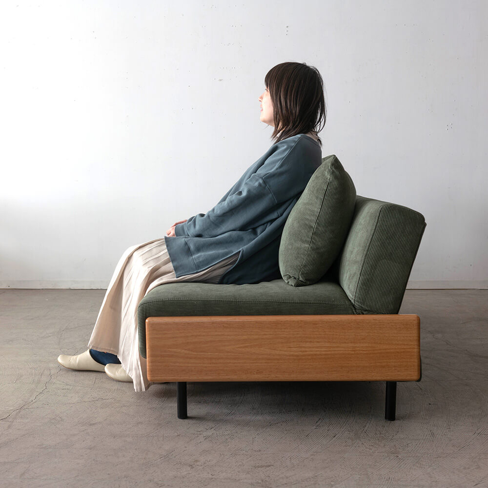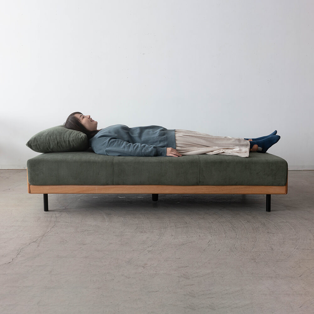 座面奥行きは約65cm。あぐらをかいたり、横向きになったりと姿勢を選ばず、身体をやさしく受け止めます。本体にはSバネとウレタンフォームを組み合わせ、クッションにはシリコンフォームを採用。沈み込みすぎず、面で支える感覚があり、ソファとしてもベッドとしても安定感のある使い心地です。