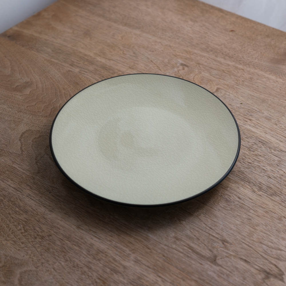 縁に施されたさび色が、淡い釉色をやさしく引き締めるアクセントに。料理の色をぼかさず、盛り付けの輪郭をきれいに見せてくれます。