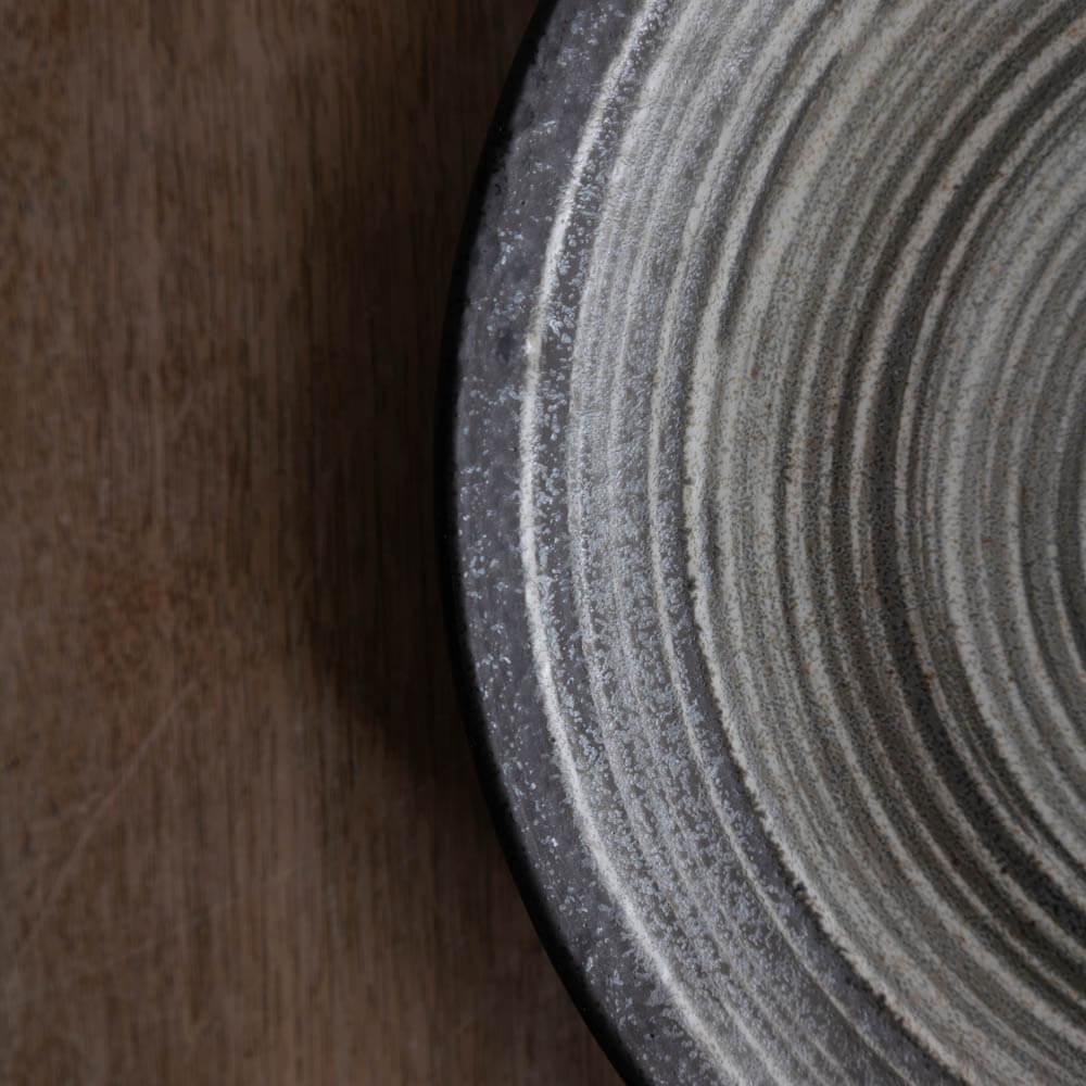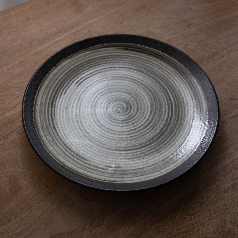 中心から静かに広がる渦模様と、外周を引き締める墨色の縁。淡いグレーの釉景色が、料理の色や質感をやさしく受け止め、盛り付けるだけで自然と“整った一皿”に仕上がります。直径約28.5cmの9寸サイズは、日常から来客時まで幅広く使える、頼れる大皿です。