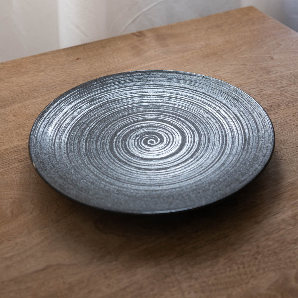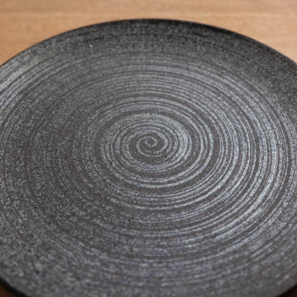 黒の釉面に、円状の渦模様が静かに広がる9寸サイズの大皿。光の当たり方や角度によって、マットにも金属的にも見え方が変わり、盛り付ける料理の色や質感を際立たせてくれます。料理をのせた瞬間に完成する、存在感のある一枚です。