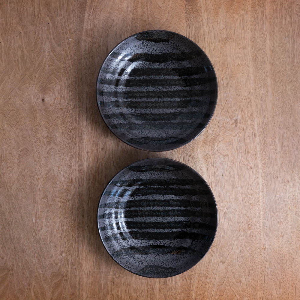 黒と灰が重なり合い、流れるように現れる縞の表情。釉薬が動いた軌跡そのものを閉じ込めたような、印象的な一枚です。規則正しく揃うのではなく、強弱をつけながら連なる模様が、器全体に自然な緊張感と奥行きを与えています。盛り付けた料理の輪郭を引き締め、食卓に静かな存在感をもたらします。