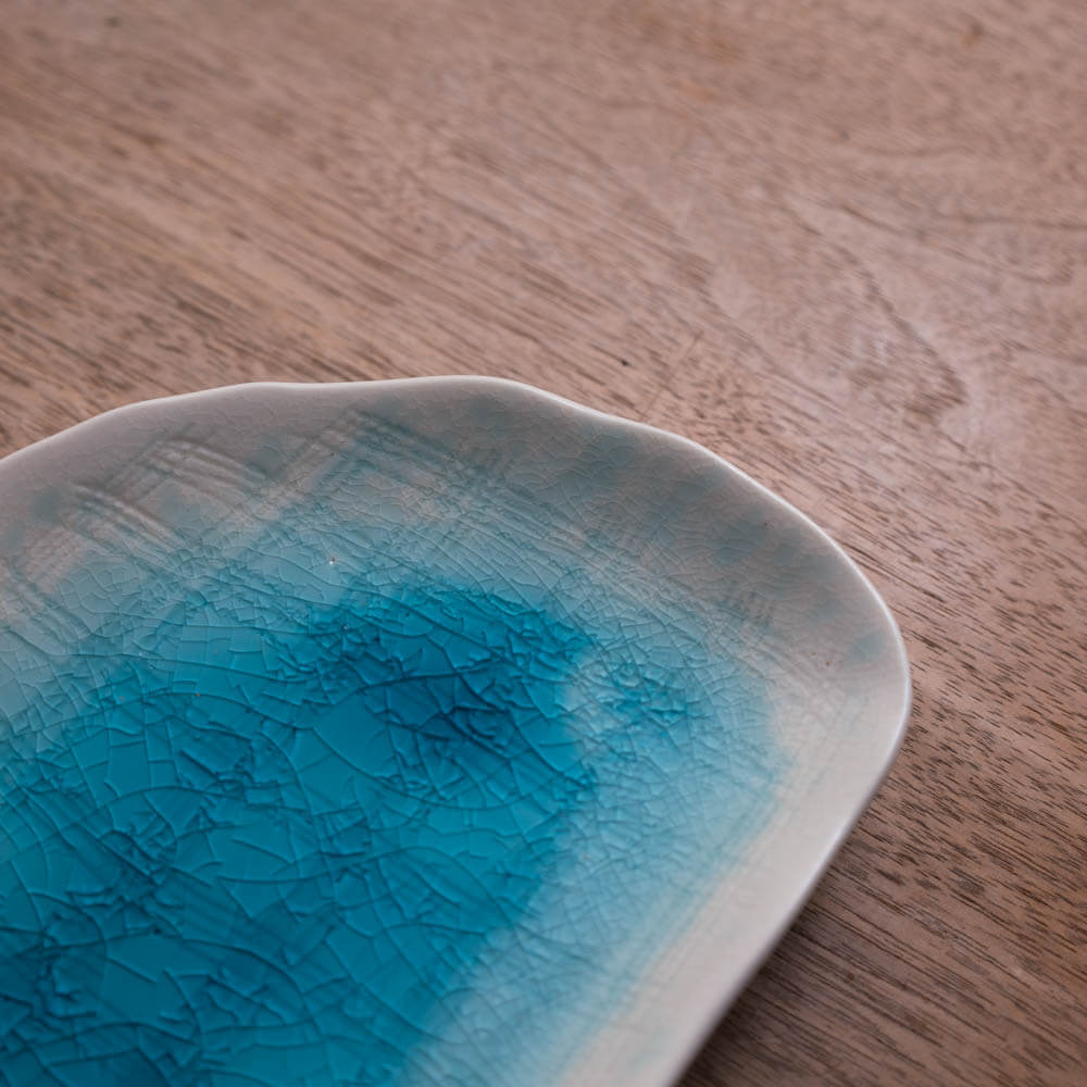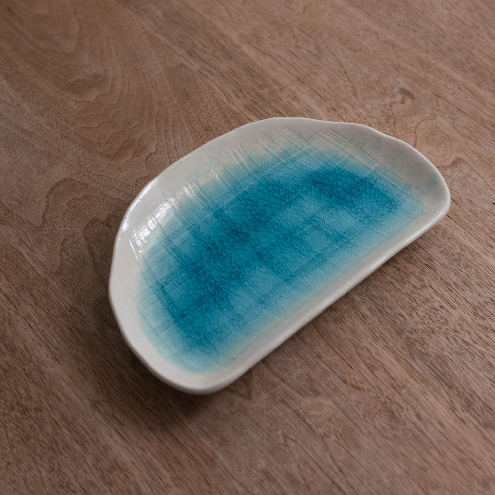 淡くにじむ白の中に、涼やかな青が静かに広がる半月皿。釉薬の濃淡がつくる層と、細かなひび模様が重なり合い、まるで雲間に光が差し込むような、奥行きのある表情を見せてくれます。直線と曲線が共存する半月型は、盛り付ける余白を美しくつくり、料理の輪郭を引き立てるかたち。日常使いにも、少し特別な一皿にも取り入れやすいサイズ感です。