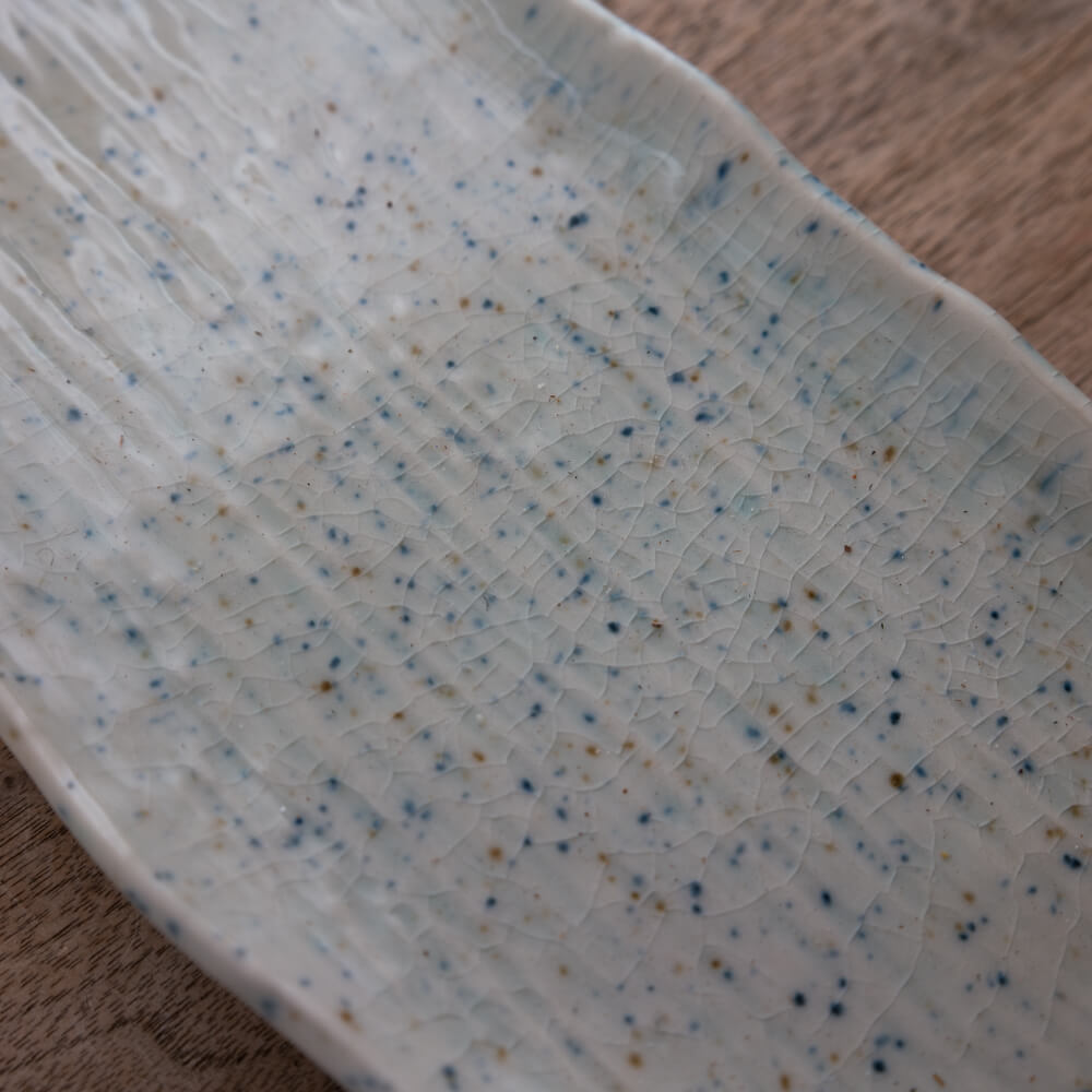点のように見える青や黄土色は、絵付けではなく、釉薬や素材の反応によって生まれた自然な表情です。同じ景色のものは一枚としてありません。