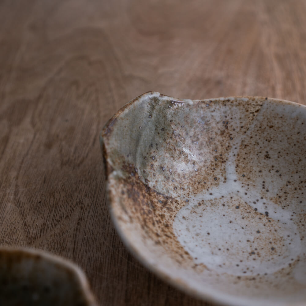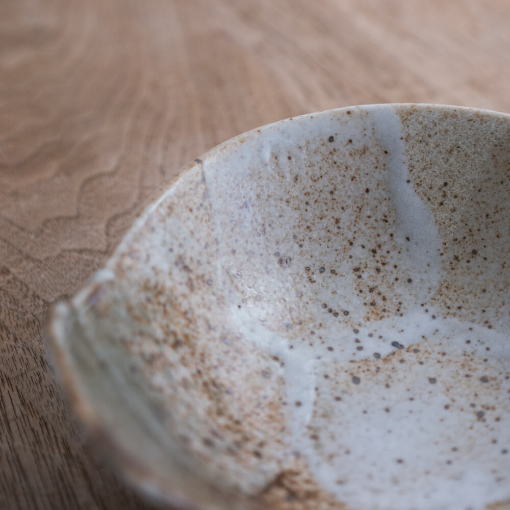 白を基調とした釉薬の中に、黄土色や灰色へと移ろう発色が静かに広がる呑水。釉薬の厚みや流れ、焼成時の反応によって生まれた色の重なりが、器の中に「景色」として残されています。呑水らしい深さを持ちながら、小鉢や浅鉢のような感覚でも使えるかたち。料理をきっちり囲いすぎず、余白を残して受け止めてくれる器です。