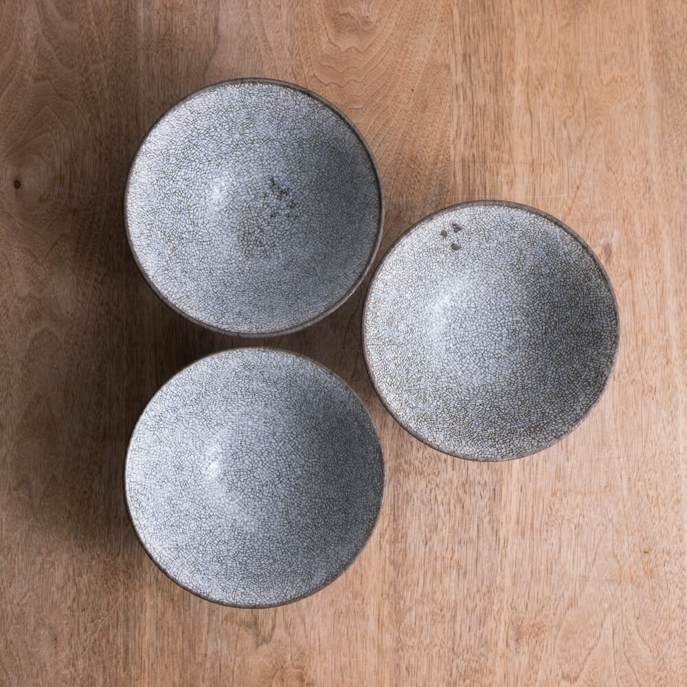 内側に広がる白釉と、表面に浮かぶ梅花皮模様が印象的な、ゆとりある大ぶり碗です。茶碗よりも深さがありながら、丼ほどの主張はなく、日常の食卓に自然と馴染むサイズ感。ごはん、汁物、軽めの丼など、使い道の幅が広く、料理を受け止める懐の深さを感じさせます。