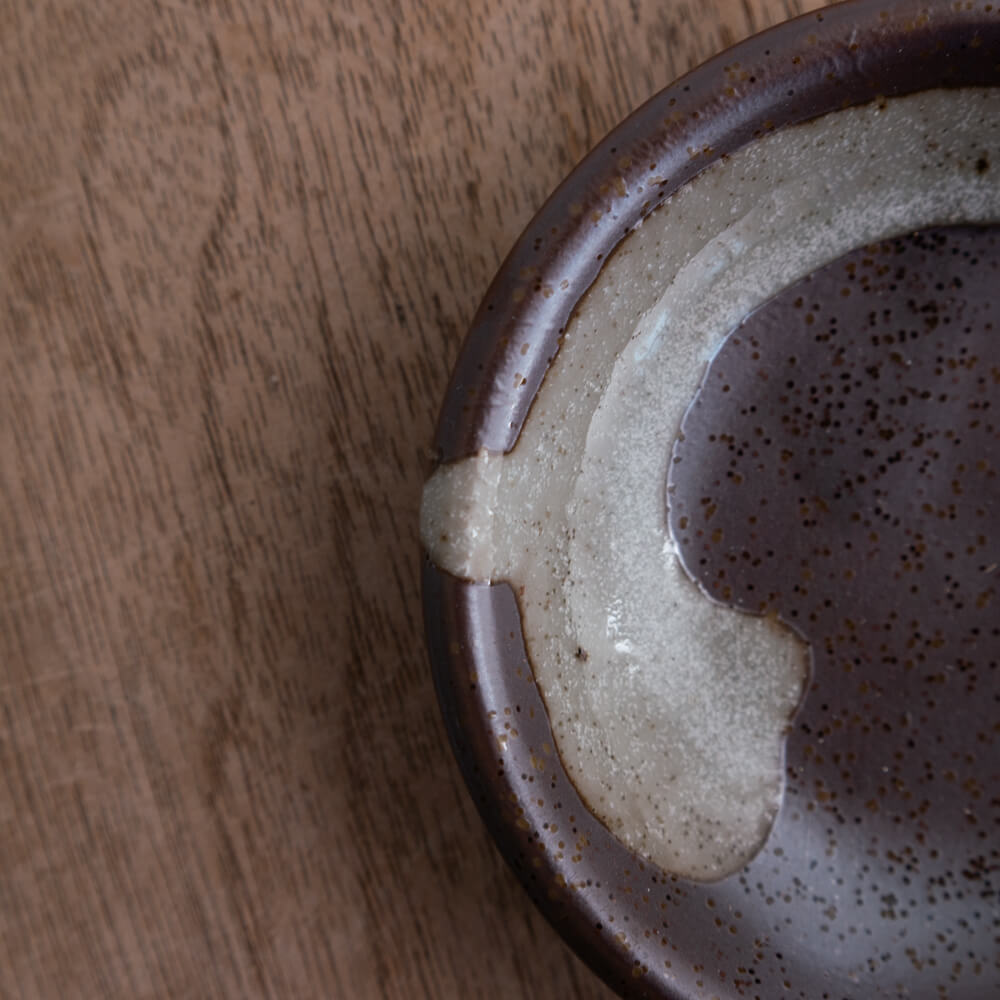 手のひらに収まる3寸サイズの小皿に、茶釉と白釉が自然に流れ、ひとつひとつ異なる景色を描いています。均一ではない色の境目、釉の溜まりやにじみがつくる表情は、盛るものを選ばず、料理やお菓子をそっと引き立ててくれます。