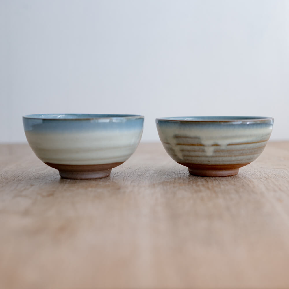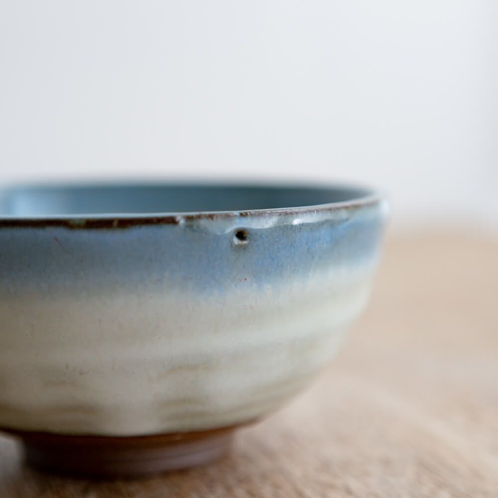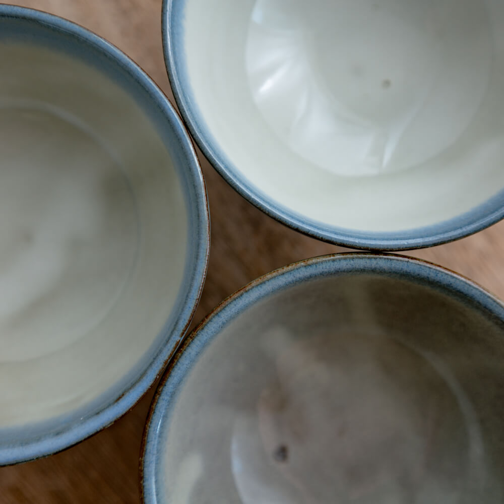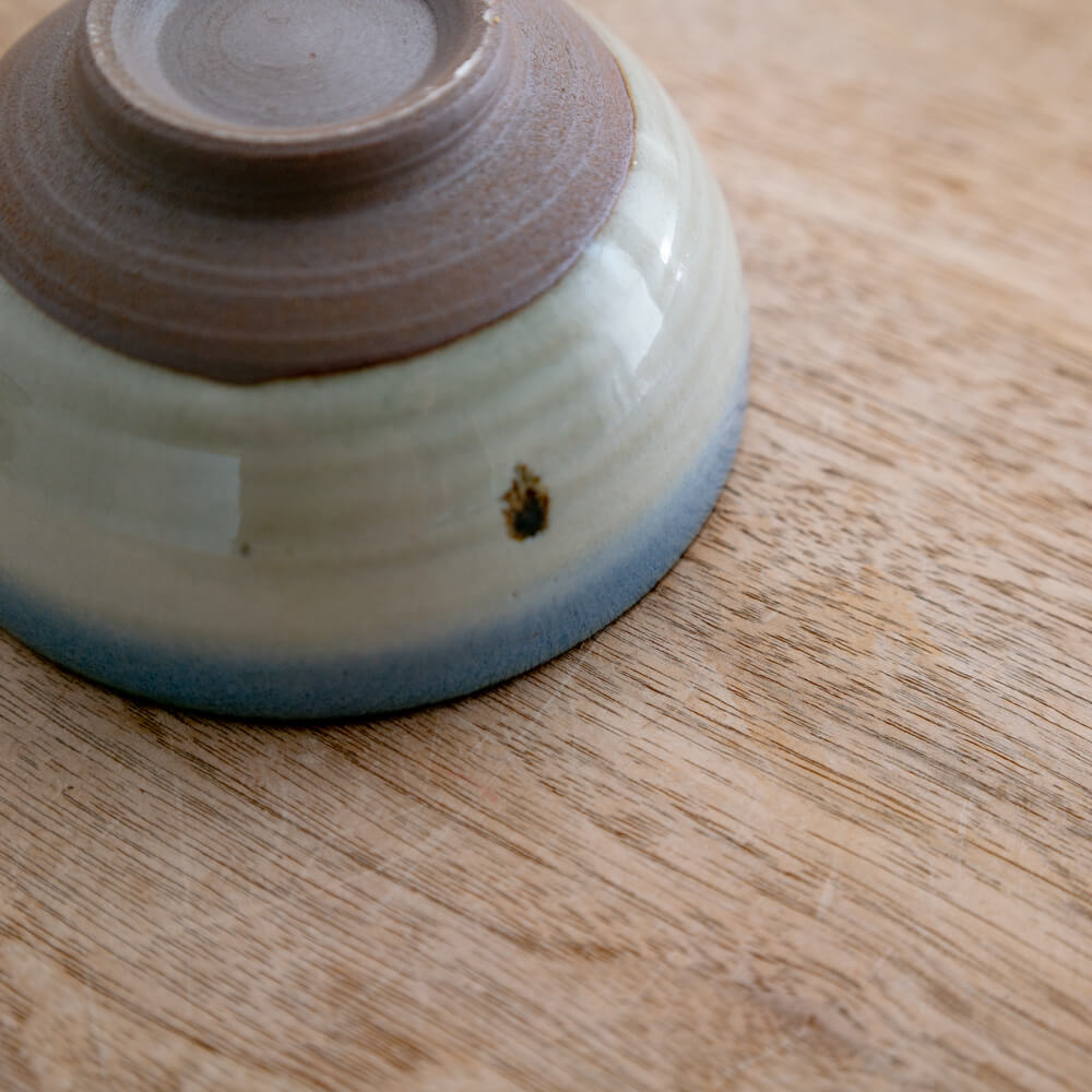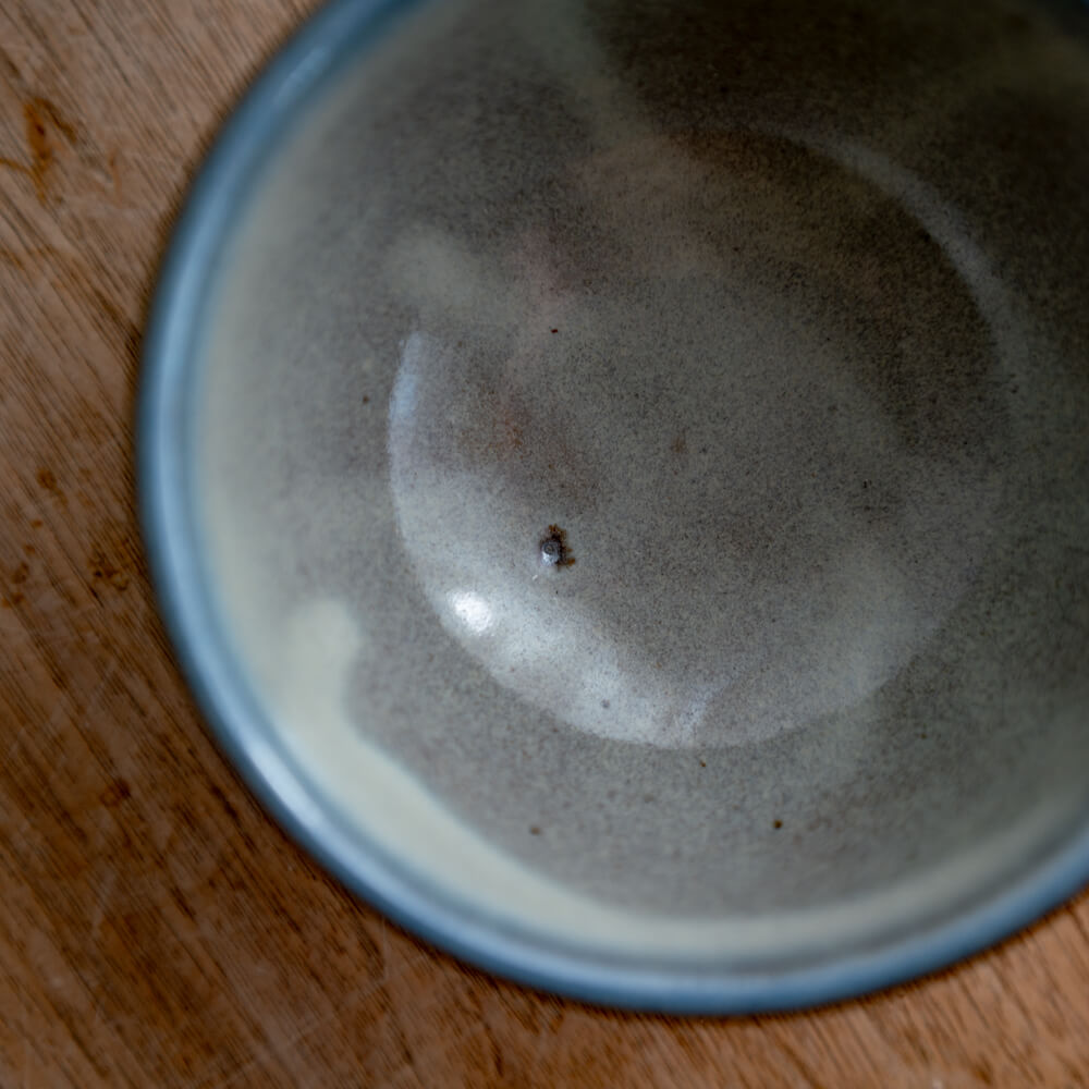 この碗の青は、器全体に広がるタイプではありません。縁に沿うように帯状に現れにじみすぎず、主張しすぎない表情です。料理の色を引き立てながら、器としての輪郭だけを整えてくれる表情です。
