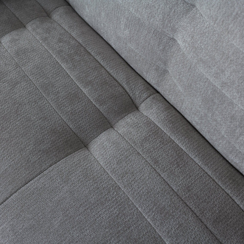 張地はファブリック素材。カラーはやや明るさを含んだグレーで、ナチュラル、北欧、シンプルモダンなど幅広いインテリアに対応します。張り込み仕様のため、カバーのズレがなく、すっきりとした見た目を保てるのも特徴です。