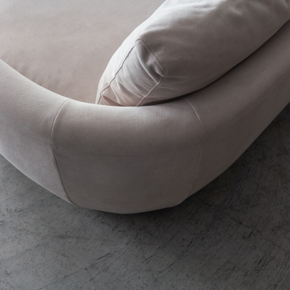 直線的なL字ではなく、丸みを帯びたラウンドフォルム。コロネル カウチソファは、ワンソファ94(R)+ワンアームカウチ(L)の組み合わせで、空間に自然な流れをつくります。幅2350mmというワイドサイズでありながら、角を感じさせないため圧迫感が出にくい設計。壁付けはもちろん、お部屋の中央に配置しても動線を妨げません。曲線があるだけで、空間は驚くほど穏やかになります。
