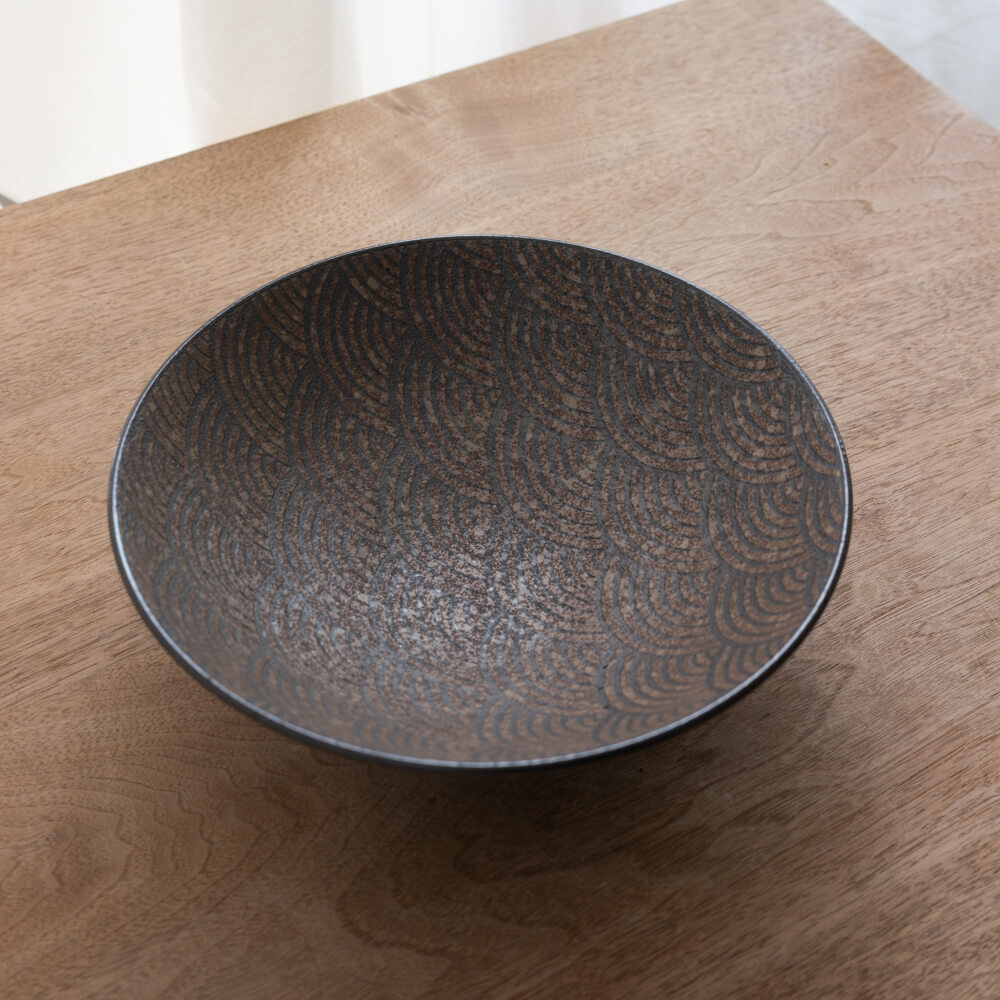 黒の濃淡差で描かれた波紋柄。光の角度によって見え方が変わり、平面の中に奥行きを感じさせます。直径約24cm、深さ約8cm。食卓の中心に置くことで、料理を引き締める8寸サイズの盛鉢です。