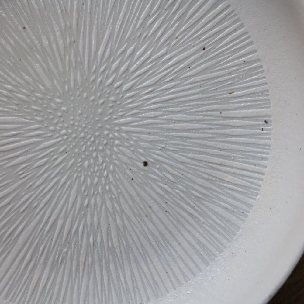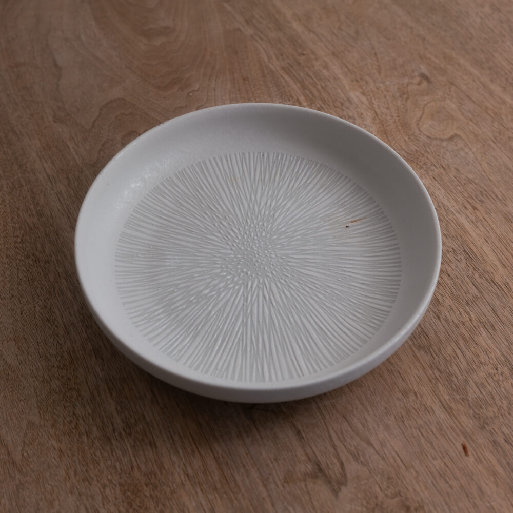 型によって施された放射の模様。均整のとれた線が、光を受けて陰影をつくります。料理を置いたとき、余白が自然に整う。平らな白皿とは違う、さりげない立体感があります。