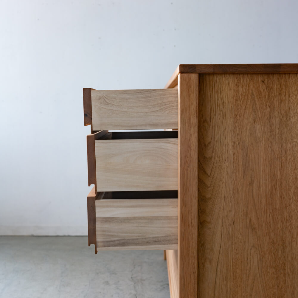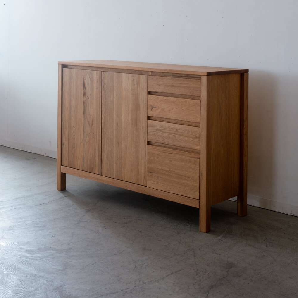 木の表情が、部屋の空気をやわらげる。リビングの“散らかりやすいもの”に、迷わない定位置をつくる収納家具です。扉収納と4段の引き出しを使い分けて、見た目も動線もすっきり整います。