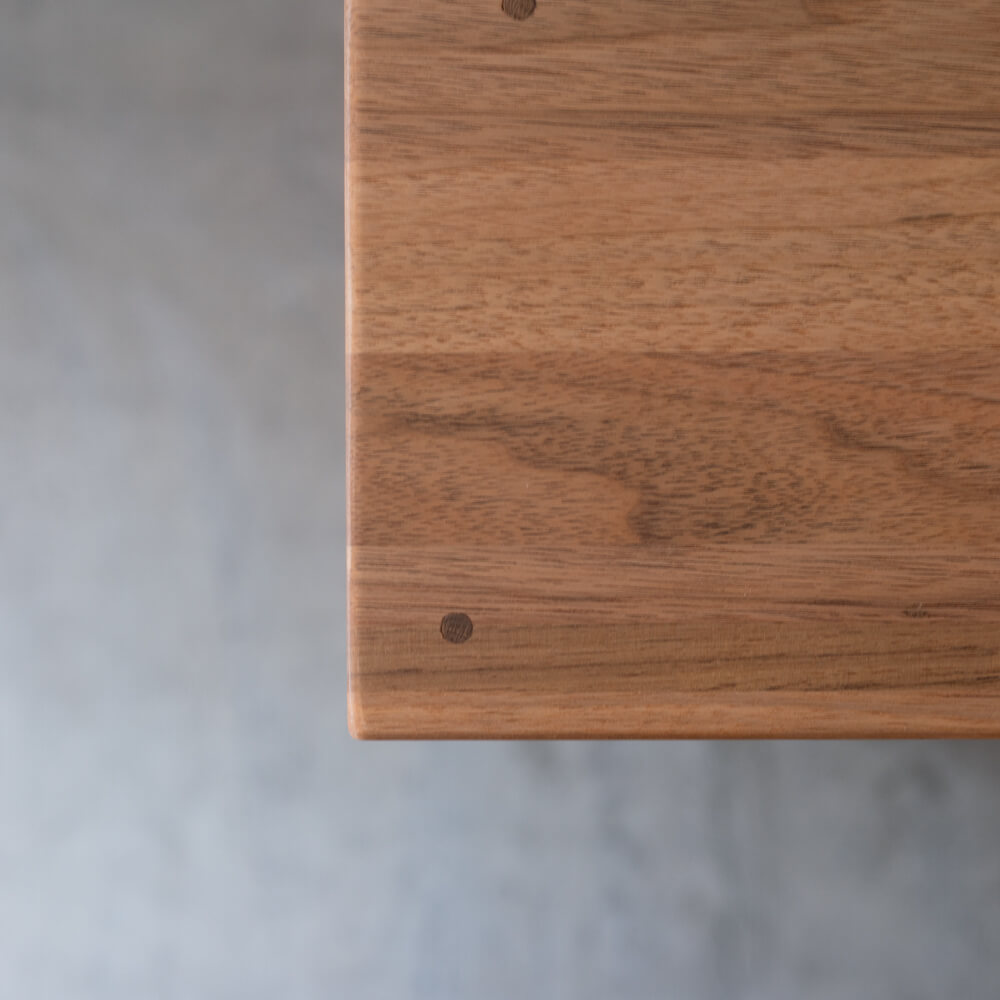 クルミ材の魅力は、木目の揺らぎと、あたたかみのある色合い。天然植物性オイル仕上げは、塗膜で覆いすぎず、木の質感を素直に楽しめます。時間とともに色が深まり、暮らしに馴染んでいく経年変化もこの仕上げならではです。