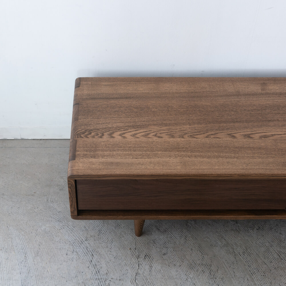 視線が低くなるだけで、部屋は広く感じます。タモ材の静かな木目とダークの陰影で、リビングの“中心”を落ち着かせるローボード。展示現品だからこそ出会える、ちょうどいい一台です。
