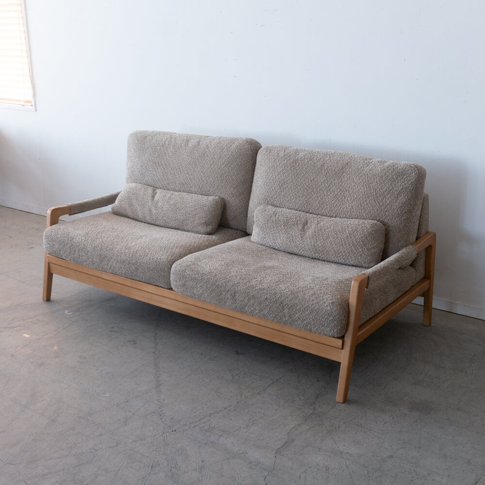 木のあたたかみと、やわらかなグレーのファブリック。座った瞬間に力が抜けて、深呼吸したくなるような“くつろぎの景色”をつくる2Pソファです。背面まで同じ生地で仕立てているので、壁付けだけでなく、お部屋の真ん中に置いても絵になります。展示現品につき、在庫は1点限り。