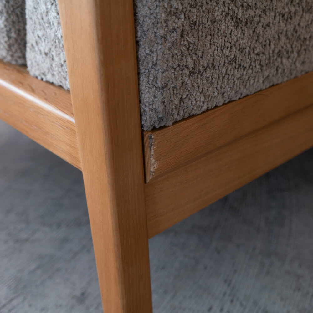 脚と肘まわりに天然木オークを用いた木フレームが、ソファのボリューム感を上手に引き締めます。ファブリックだけのソファよりも“輪郭”が出るため、北欧・ナチュラル・Japandi・ミッドセンチュリーなど、木の家具が多いお部屋に自然に馴染みます。