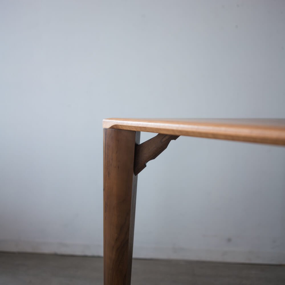 テーブル天板はウォールナット天然木(集成材)。ウォールナットらしい濃淡と木目の流れを楽しみながら、日常使いで扱いやすい仕様です。天板裏には補強金物が備わり、しっかりとした安心感につながっています。