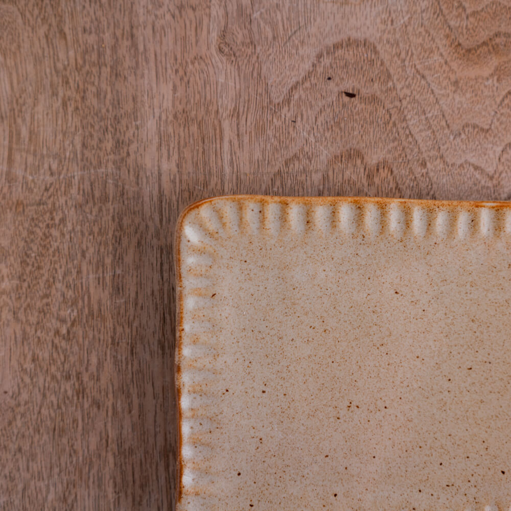あたたかい生成り(アイボリー)に、細かな鉄粉が散った表情。横長のかたちは、焼き魚やおかずをすっきり見せて、食卓の“まとまり”をつくってくれます。縁に入った削ぎのリズムが、料理の輪郭をやさしく引き立てる一枚です。