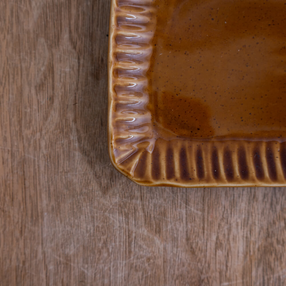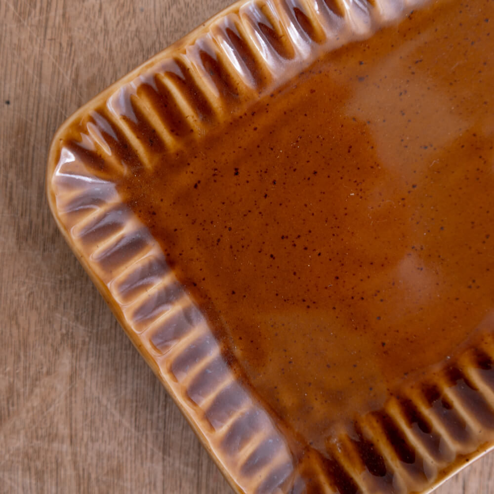 艶のあるアンバー色に、縁の“削ぎ(しのぎ)”がきらり。料理をのせると輪郭がすっと整い、いつもの一品が少しだけ上品に見える長方形の角皿です。取り皿にも、軽い主菜にも使いやすいサイズ感で、食卓の出番が増えていきます。