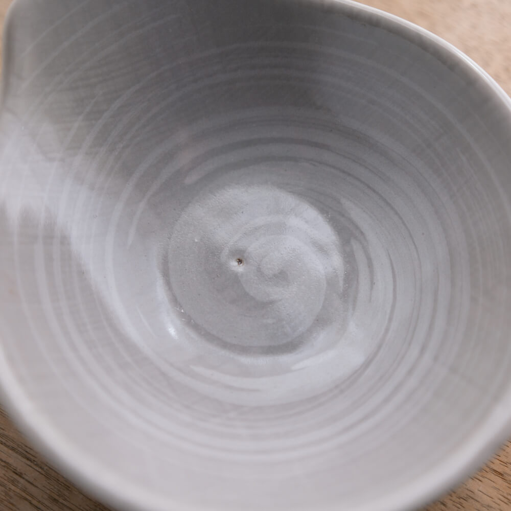 やわらかなグレーに、白いうず模様がすっと立ち上がる一枚。深さのある形と小さな注ぎ口が、煮びたしのつゆ、麺つゆ、あんかけなど“汁気のあるおかず”まで美しく受け止めます。食卓に置くと、派手ではないのに印象が整う器です。