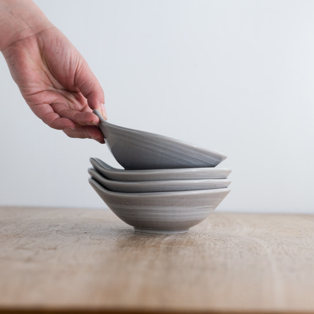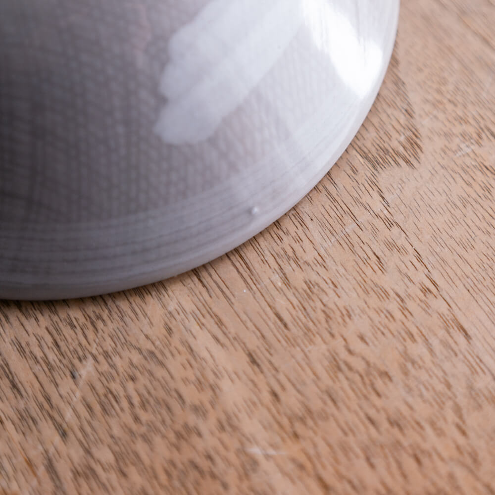 柔らかいグレーは、白い器ほど汚れが目立ちにくく、黒い器ほど強く主張しません。和食器にも洋食器にもなじみ、木のテーブルとも相性が良い色味です。光の当たり方で白いうず模様の見え方が変わるため、いつもの料理でも表情が出ます。