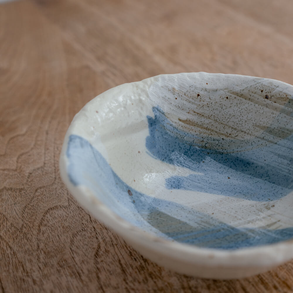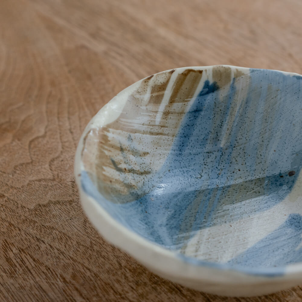 白〜生成りのやわらかな地に、淡いブルーグレーの刷毛目。石の輪郭のような変形リムが、いつもの副菜やフルーツをすっと引き立てる小鉢です。深さがあるので、汁気のある和え物やヨーグルトにも使いやすい形です。