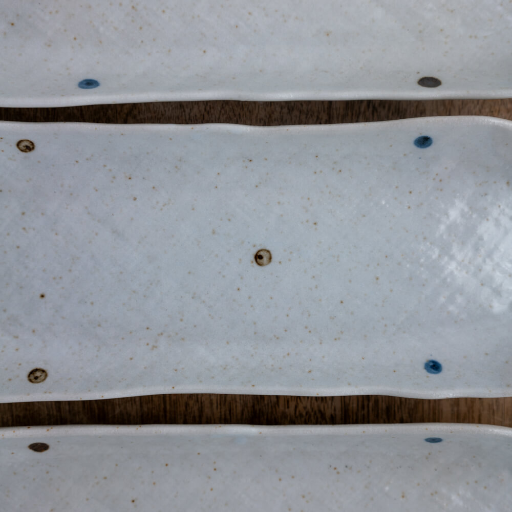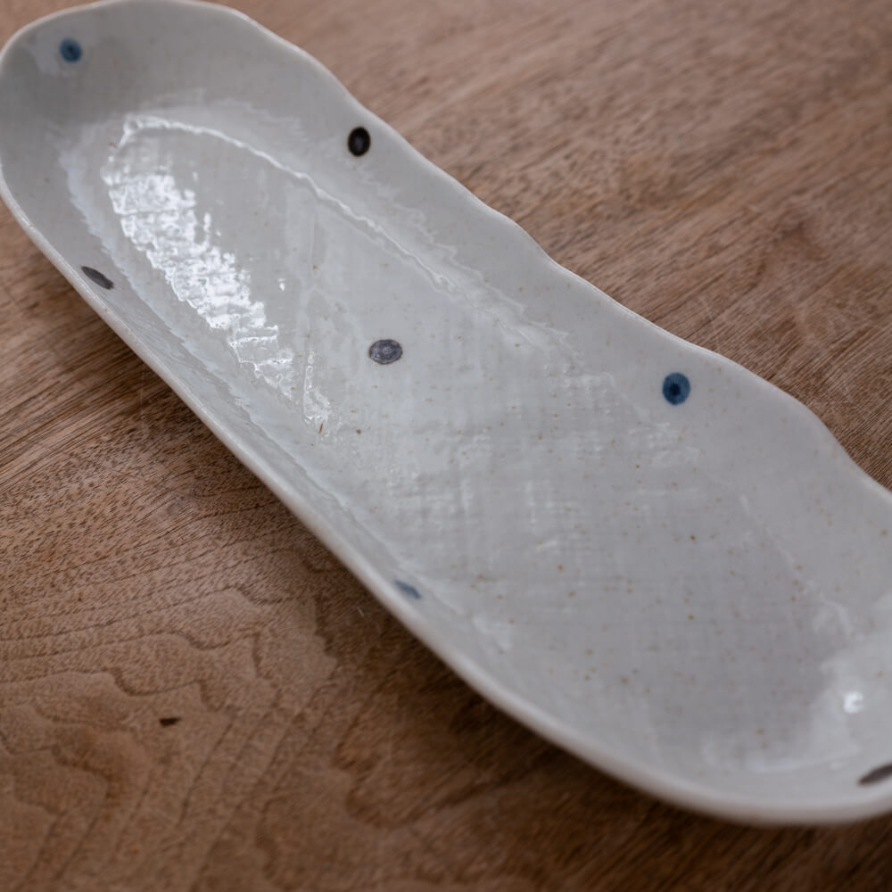 白の釉薬に、青とこげ茶の小さなドット。すっきり細長い小判形に、縁のゆらぎと“ほどよい深さ”が加わって、盛り付けるだけで料理の輪郭がきれいに見える一枚です。前菜、焼魚、サンドイッチ、和菓子まで、細長い器が得意なメニューが増えていきます。