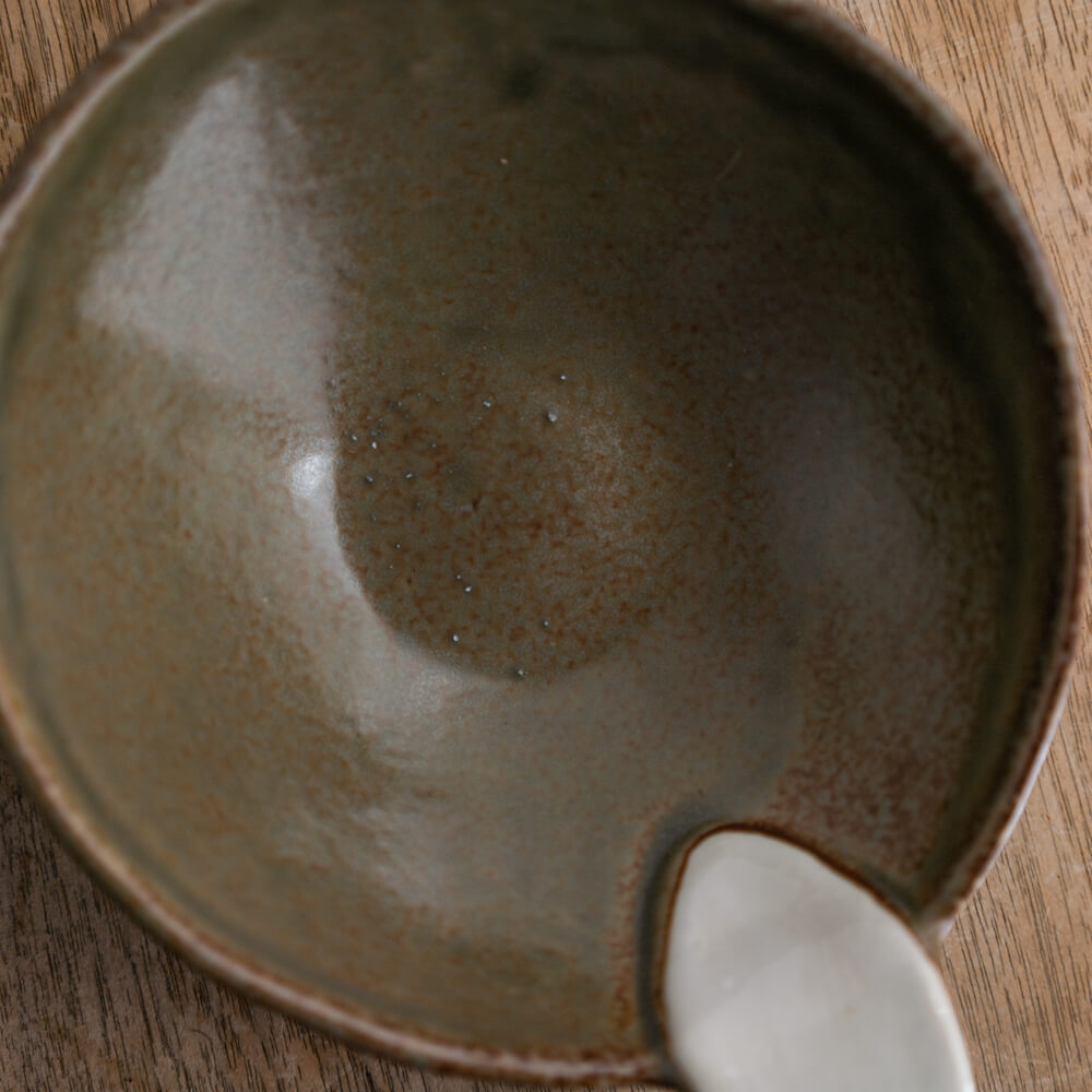 湯気の立つ鍋料理、だしの効いた煮物、胡麻だれを絡めた野菜。つやっとした釉薬の景色が、汁気のある料理をおいしそうに受け止める、取っ手付きの小鉢です。白い持ち手がさりげないアクセントになり、食卓に抜け感をつくります。