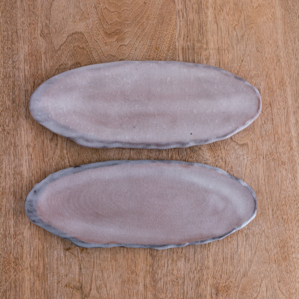 淡いグレーにほんのり紫みを含んだ、やわらかな“霞色”。雲のように輪郭がゆらぐ長皿は、盛り付けに余白が生まれて、焼き魚や前菜、サンドイッチまで絵になります。表面に広がる貫入(釉薬のひび模様)が、光を受けて静かに表情を変える一枚です。