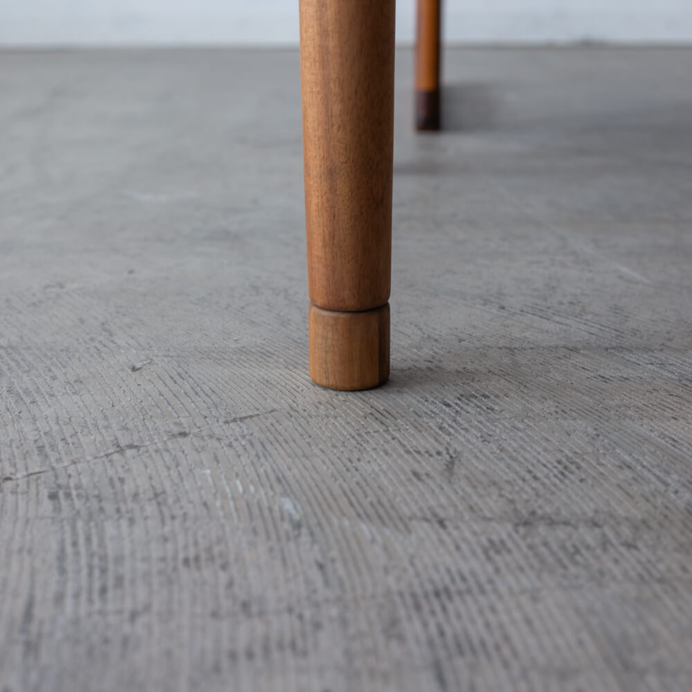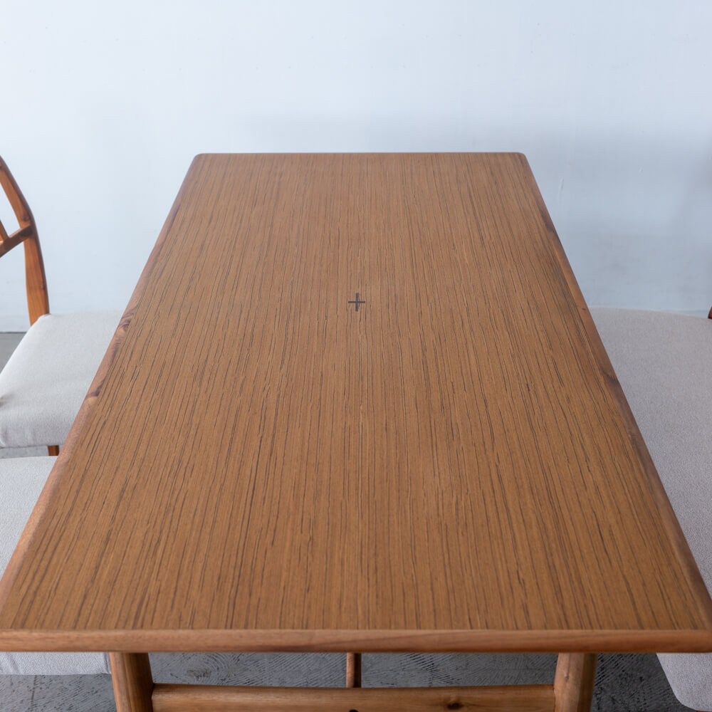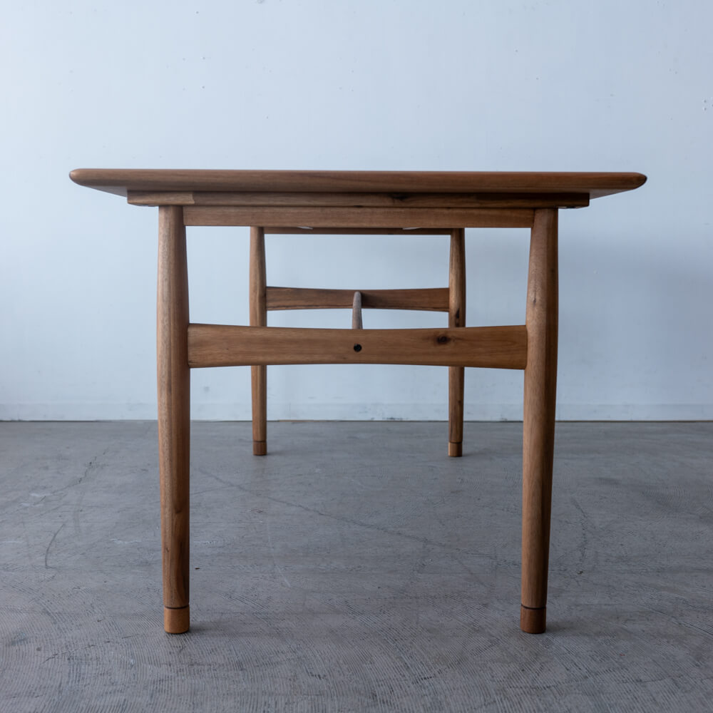 テーブル天板には、美しい木目を持つチーク材突板を使用。脚部には耐久性の高いアカシアマンギウム無垢材を使用しています。天然木ならではのやさしい質感と自然な色合いが、食卓に温もりを与えます。ダイニングテーブルとしてはもちろん、広めの作業スペースとしても使いやすいサイズです。