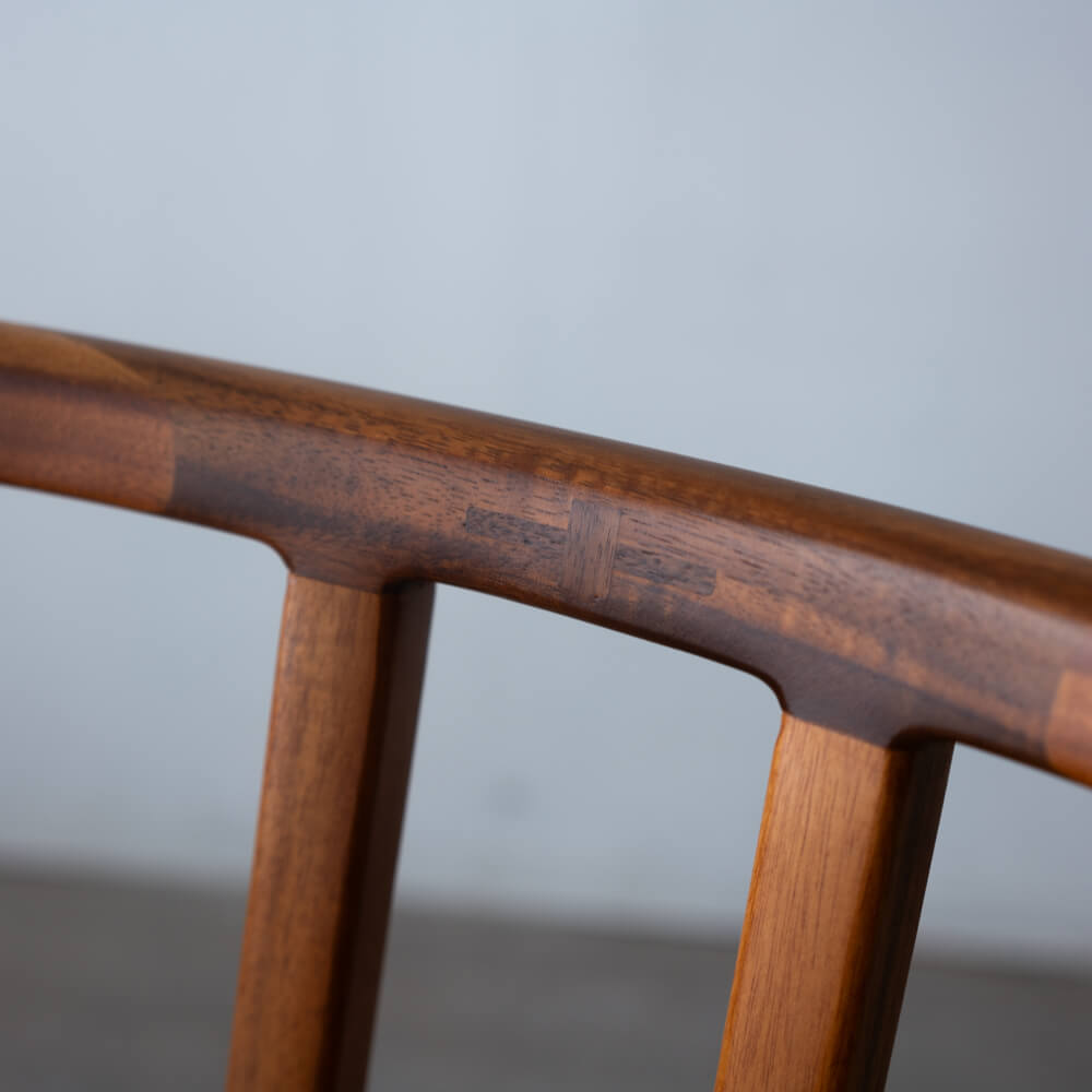 チェアは丸みのあるフレームと、背もたれの象嵌細工が特徴です。背面の十字デザインがアクセントとなり、シンプルながら個性を感じる仕上がりです。広めの座面とクッション性のあるシートで、長時間座っても快適に過ごせます。座面には撥水加工ファブリックを使用しており、日常使いにも安心です。