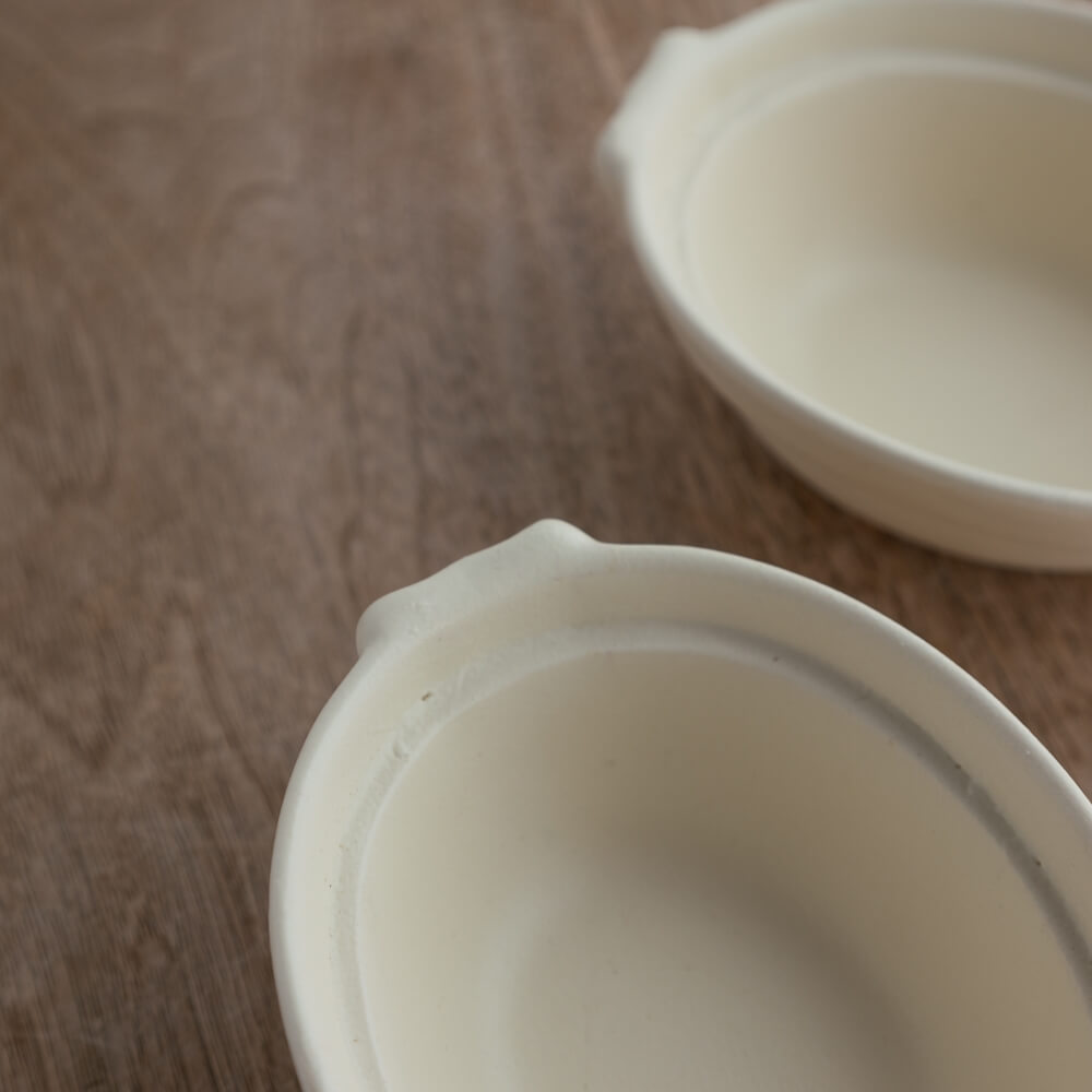 両サイドに小さな持ち手のような耳が付いた形が、食卓にやさしい表情を添えてくれます。シンプルな白い器でありながら、ほんの少し個性があり、盛りつけた料理を単調に見せません。