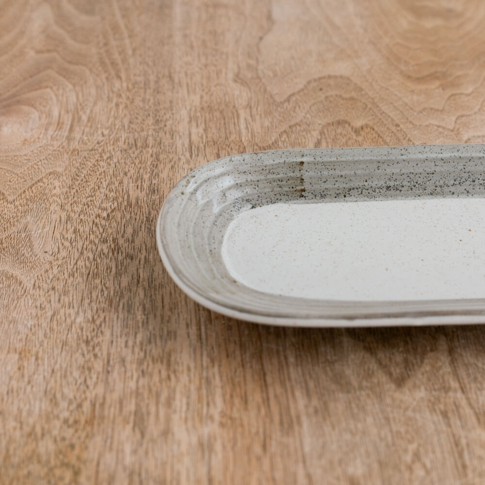 細長い楕円のかたちに、やわらかな白と茶の濃淡が重なった長皿です。焼き魚や串もの、前菜の盛り合わせはもちろん、余白を活かして一品をすっきり見せたい時にも映える一枚。食卓に置くだけで、料理が少し整って見える落ち着いた雰囲気があります。