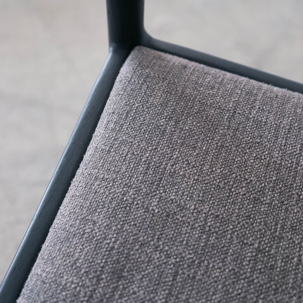 座面にはポリエステル100%のファブリックを採用。木座よりもあたりがやわらかく、食事や会話、ちょっとした作業時間も快適に過ごしやすい仕様です。アームに軽く肘を預けられるため、一般的なダイニングチェアよりもリラックス感のある座り心地が期待できます。