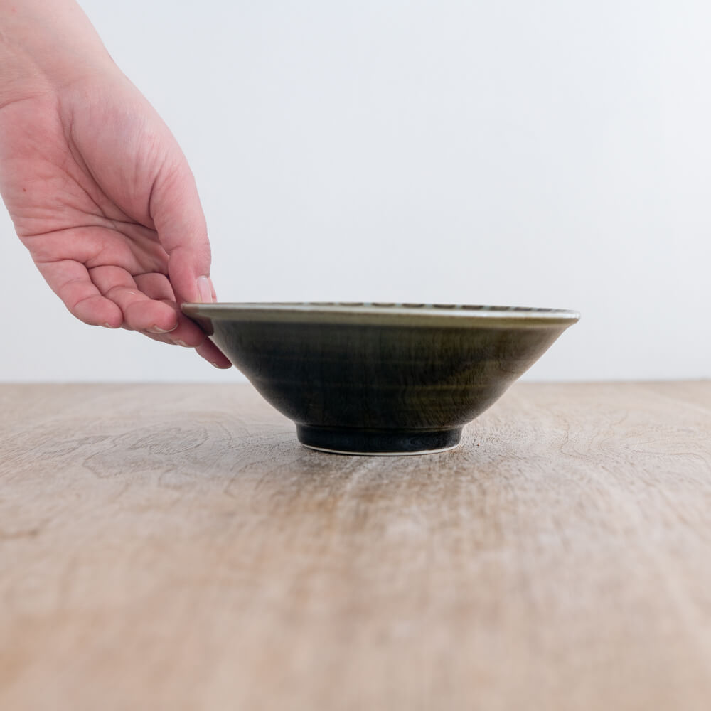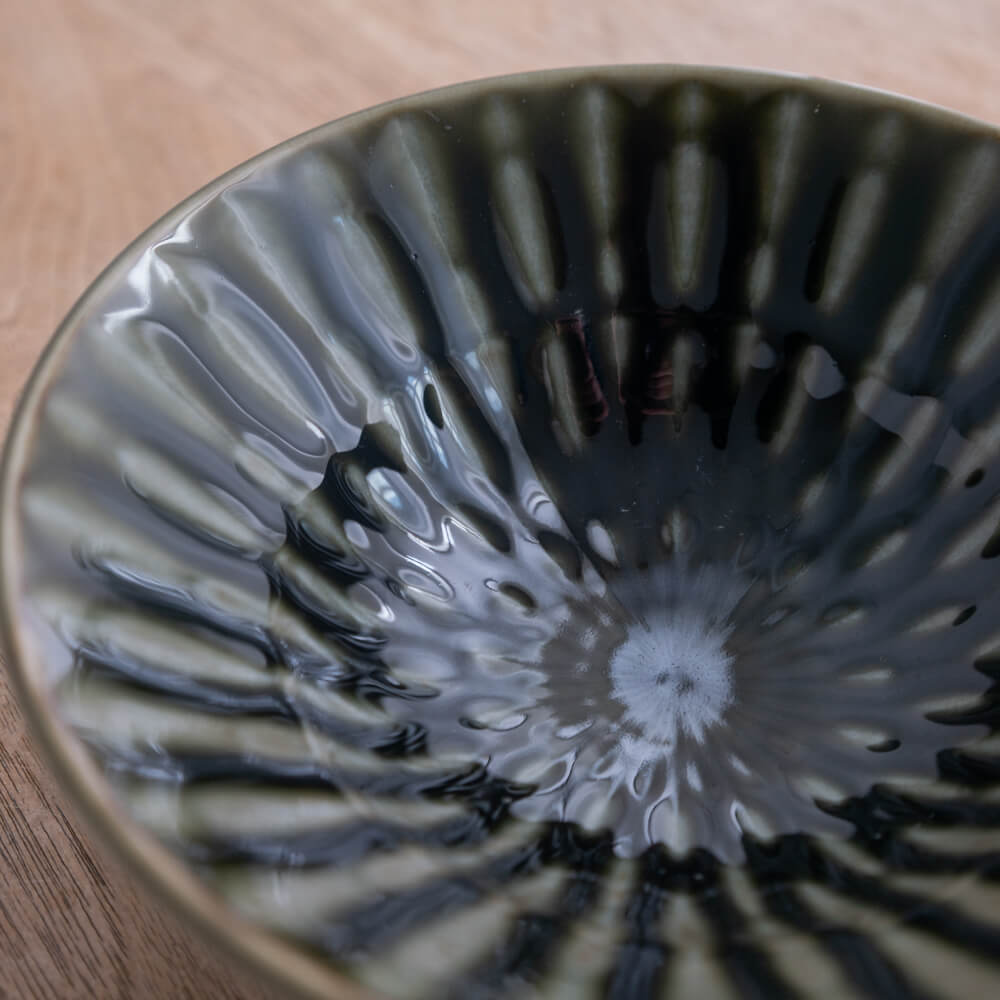 黒に近い深い色のなかに、オリーブグリーンの濃淡がやわらかく広がる深鉢。見込みに放射状の表情が入っていることで、料理を盛ったときにも余白が単調にならず、煮物やサラダ、麺もの、丼の取り鉢まで、いつもの一品を印象的に見せてくれます。