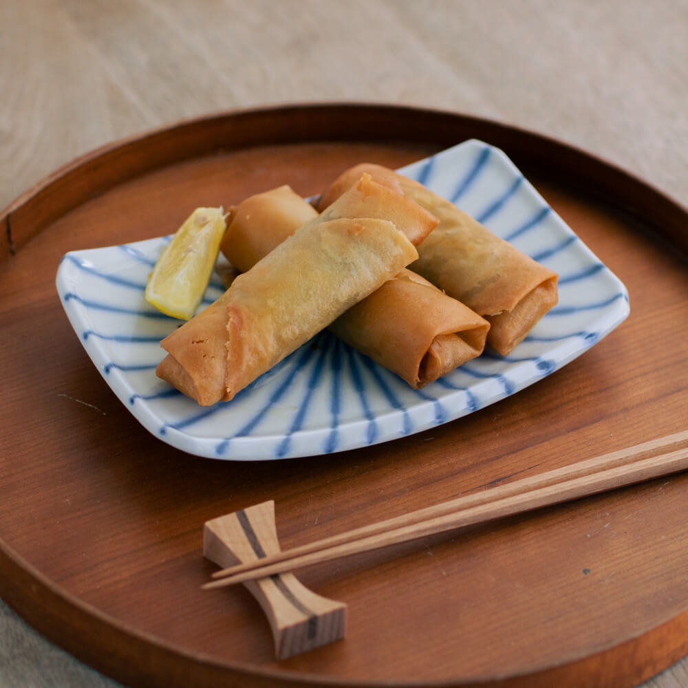約18.5×12cmの長角皿は、食卓の中で場所を取りすぎず、主菜の添え皿や取り皿、副菜皿として使いやすいサイズ感です。丸皿よりも横に流して盛りつけやすいため、焼き魚、卵焼き、おにぎりとおかず、小さなおつまみの盛り合わせなどにもよく合います。
