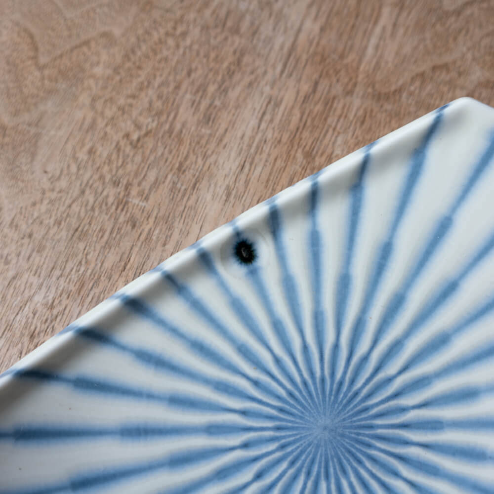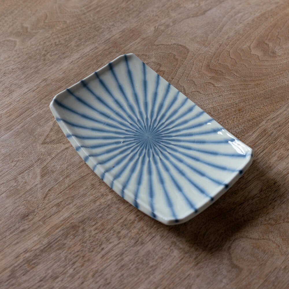 中心から外へ向かって広がる放射模様が、料理の輪郭を自然ときれいに見せてくれます。白地に青が映える配色なので、焼き魚やお刺身、だし巻き卵、焼き野菜、前菜の盛り合わせなども間延びせず、すっきりした印象に。盛りつけるだけで食卓にほどよいリズムが生まれます。