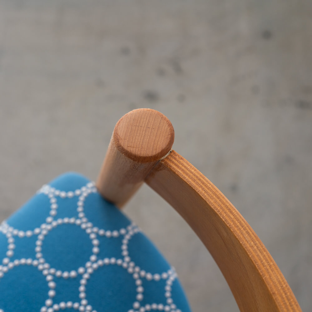 やわらかな木肌に、ミナ ペルホネンのtambourineが映える一脚。国産ブナ材のぬくもりをそのままに、お客様からお譲りいただいた椅子を丁寧に整え、新たな表情でよみがえらせたアップサイクル品です。