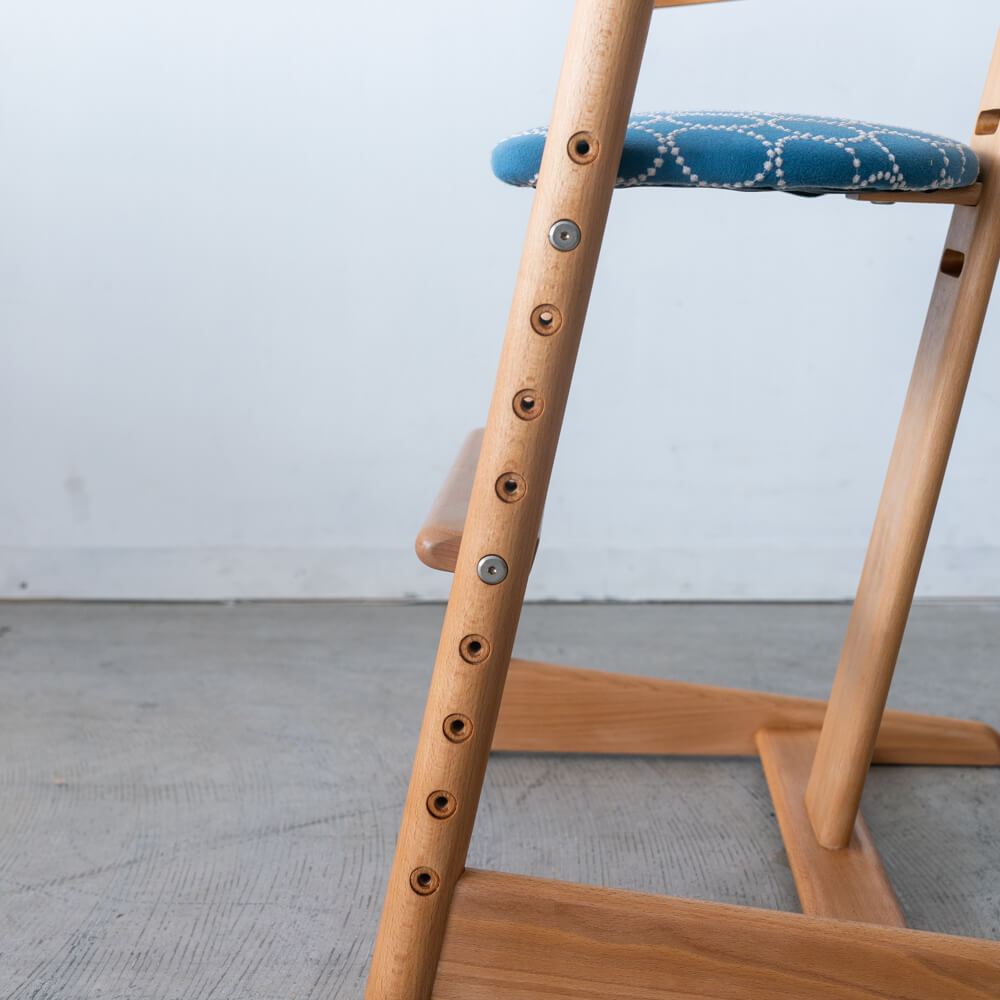 こちらは、お客様から買い取りした木馬舎のキッズチェアに新たな張地を施し、再び気持ちよく使っていただけるよう丁寧にメンテナンスを行ったアップサイクル品です。