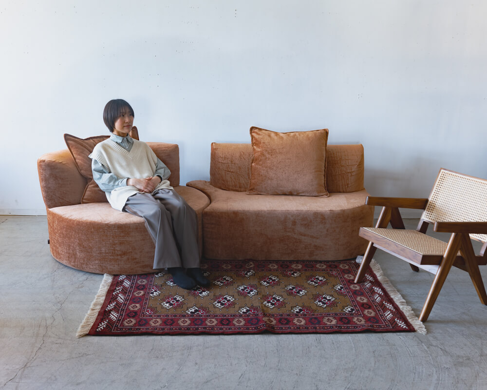 奥行にも余裕があり、正面から座るだけでなく、脚を伸ばしたり、あぐらをかいたり、横向きに座ったりと自由度の高いくつろぎ方ができます。アームレスに近い開放感があり、暮らしの中で自然に使いやすいソファです。