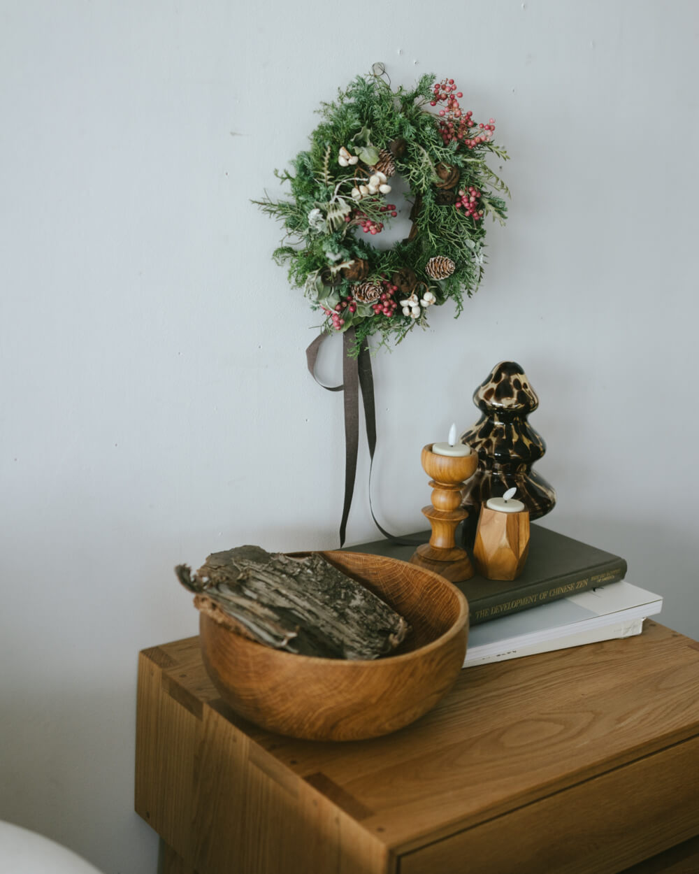 仕上げたリースはご自宅のリビング・玄関・テーブルなどに飾ってお楽しみいただけ、徐々にドライへ移ろう表情も味わえます。初めての方でもOK。スタッフがやさしくレクチャーします。