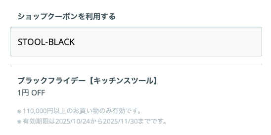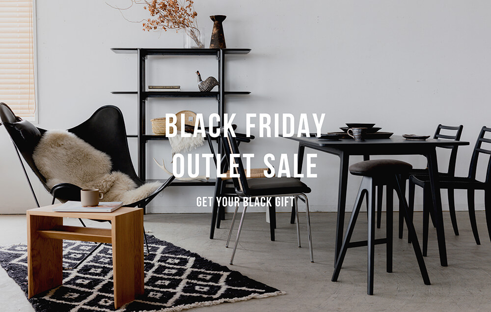 OUTLET価格の家具が、ブラックフライデーでさらに魅力的に。合計税込¥110,000以上(雑貨同梱OK)のお買い上げで、黒のサイドテーブルまたは黒のキッチンスツールをクーポン入力でプレゼント(在庫限り)。