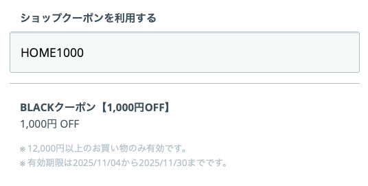 カート内のクーポン欄にコード入力 → ¥1,000OFFが表示されます。