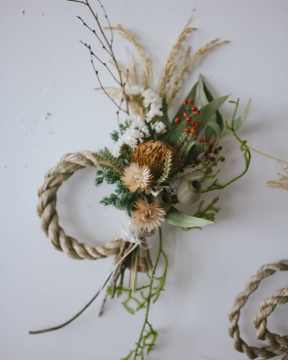 cocochiでは、ドライフラワーを使ったスワッグタイプのしめ縄飾りワークショップを開催します。